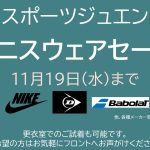 11月5日(水)よりジュエンさんのテニスウェアセールを開催しております。 更衣室でのご試着も可能です。 みなさまのご利用をお待ちしております!