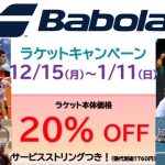 Babolat(バボラ)のラケットキャンペーンを開催中です!! 期間:12/15(月)~1/11(日) ラケット本体価格より20%オフ!! サービスガット付きです。(ガット張代別途 1,760円) &…