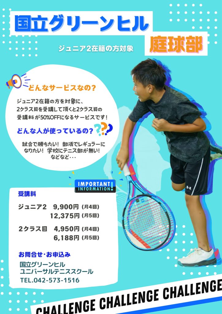 当スクールでは以前より、ジュニア2にご在籍の方を対象として、<平日2クラス目半額>のサービスを行っておりますが、この度、名称を【国立グリーンヒル庭球部】とし、引き続き同様の割引サービスを行ってまいります。